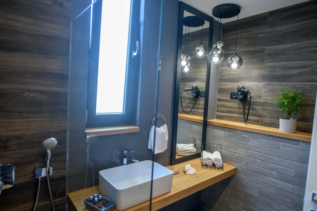 Baia este elegantă, dotată cu duș walk-in, prosoape și cosmetice, pentru un plus de confort.