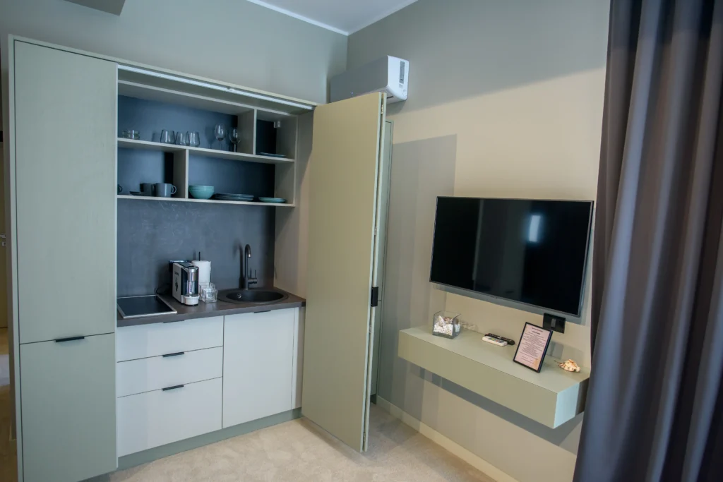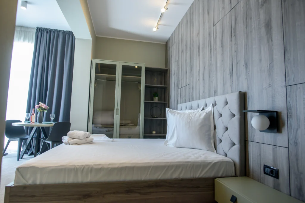 Acest studio modern și confortabil este locul ideal pentru un sejur relaxant la malul mării. Camera luminoasă dispune de pat matrimonial generos (180×200), iar chicineta complet utilată îți oferă tot ce ai nevoie pentru momentele petrecute aici.
