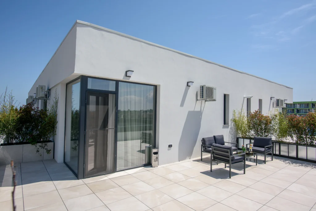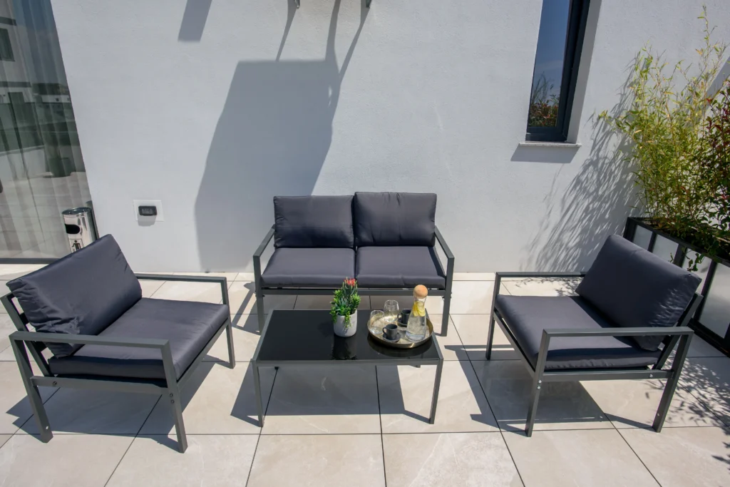 Terasa spațioasă, mobilată cu set de exterior și șezlonguri, te invită la relaxare și la seri de neuitat. De aici te vei bucura de o vedere laterală la mare și de un apus superb, care colorează cerul în nuanțe spectaculoase chiar în fața ta.