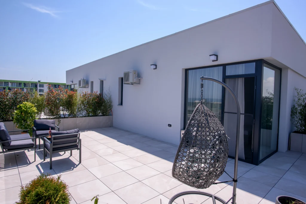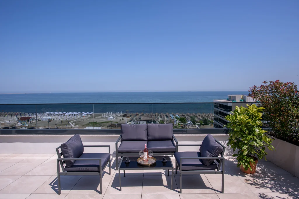 Piesa de rezistență este terasa spațioasă, dotată cu mobilier și șezlonguri, unde te poți relaxa admirând vederea frontală spectaculoasă la mare. Seara, liniștea și sunetul valurilor creează o atmosferă unică, perfectă pentru momente de răsfăț și relaxare.