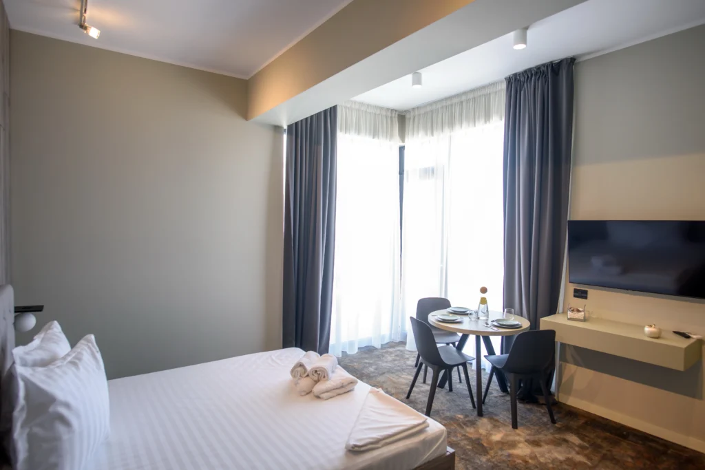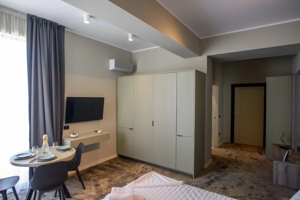 Acest studio cochet și elegant îți oferă tot confortul de care ai nevoie pentru o vacanță relaxantă la malul mării. Spațiul este alcătuit dintr-o cameră luminoasă cu pat matrimonial generos (180×200), ideal pentru odihnă și confort deplin.